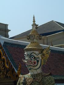 Der erste Teil des Palastes, den man betritt, ist der Tempel des Smaragdbuddhas (der in Wirklichkeit aus Jade besteht - seinen Namen hat er mangels materialwissenschaftlicher Kompetenz eines Mönches bekommen), und auch wenn ich den schon zum zweiten Mal angeschaut habe, ist immer noch schwer zu glauben, dass es auf der Welt so viel Gold gibt. Dieser Tempel ist einfach unglaublich! Der Tempelhof steht voll von Gebäuden dicht an dicht, die zumeist mit Gold verkleidet sind, darunter eine große Stupa (diese glockenförmigen Bauten), und natürlich das Gebäude, das den Smaragdbuddha enthält. Es ist ein überwältigend prachtvoller Bau. Am Eingang und an vielen weiteren Stellen rundherum stehen große Wächterstatuen, die man eigentlich nie von weitem sehen kann (weil einfach nicht so viel freier Platz ist) und zu denen man deswegen nur aufblicken kann. Eine Statue gleich am Eingang ist einem alten chinesischen Arzt gewidmet, und zwischendrin gibt es noch einen Platz, an dem Götter in Form von Kühen verehrt werden. Einige der Gebäude stehen auf einer Terasse, die rundherum von goldenen Garudas und anden mythischen Figuren gesäumt wird. Selbstverständlich gibt es auch goldene Nagas. Die Außenwände sind detailliert mit Szenen aus dem Ramayana bemalt. An einer Stelle steht ein Modell von Angkor Wat, denn dieser Teil Kambodschas zu Siam gehört, bis in der Kolonialzeit Siam diese Provinz an Frankreich abtreten mußte. Im Gebäude des Smaragdbuddhas darf man nicht fotografieren, und es war voller betender Thai, so dass man auch nicht besonders nahe an die Figur herankam - sie ist nicht einmal einen Meter groß. Ich hatte beim Betreten einen Fauxpas begangen, indem ich zwar meine Schuhe ausgezogen habe, aber vergaß, meinen Hut abzunehmen. Der Tempel des Smaragdbuddha ist der Privattempel des Königs, der aber inzwischen einen abgeschirmten Bereich und einen Geheimgang hat, damit man nicht jedes Mal den Tempel räumen muß, wenn der König zum Beten kommt.