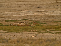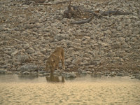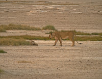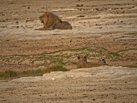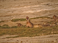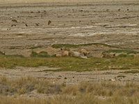 The Etosha National Park is the last area in Namibia where lions roam. They are one of the reasons why you should not leave your car outside fenced-in areas (if they want to, they are well hidden until you step onto their tails). Though lions tend to be lazy and, due to the abundance of antelope, well-fed, there are always stories about careless visitors. Lions learn quickly which species are easy to hunt and humans and domestic cattle are among the easy prey. There are ways to deal with lions, though: being big like an elephant or rhino helps, and springbok successfully confuse lions with their erratic jumps. Lions are wary of anything that doesn't run away. Observing a group of lions during daytime is not so interesting. They are a lazy bunch and just sleep a lot