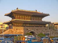 Zwei der alten Stadttore von Seoul stehen noch, Namdaemun (Südtor) und Dongdaemun (Osttor). Koreanisch ist gar nicht so schwer zu lernen: „Nam“ heißt „Süd“, „Dong“ heißt „Ost“ und „Daemun“ heißt „großes Tor“. An beiden Toren gibt es jeweils einen großen traditionellen Markt, der bis in die frühen Abendstunden aktiv ist; der Namdaemun-Markt ist der für Touristen interessantere, mit vielen Essensständen, Andenkenläden und anderem. Leider ist das Tor selbst nach einem Anschlag eingerüstet worden. Am frühen Abend bin ich vom Namdaemun-Markt durch Myeong-Dong zum Namsan Park mit dem N-Seoul-Tower gegangen. Der Namsan ist ein kleiner Berg mitten in der Innenstadt von Seoul, südlich der Altstadt (klar – wer oben aufgepaßt hat: „Nam“ heißt „Süd“) aber noch nördlich von Itaewon (dem ehemaligen Ausländerbezirk) und des Han-Flusses, und damit in der Nordhälfte der Stadt. Auf dem Berg steht besagter Turm (ein Fernmeldeturm). Abend für Abend gibt es dort eine gute Lightshow; den Berg erreicht man mit einer Seilbahn für 7.500 ₩ (4,40 €), zur Bodenstation geht es aber schon steil die Straße hinauf. Auf den Turm selbst kommt man wiederum für 6.000 ₩ (3,52 €), aber meiner Meinung nach lohnt sich das nicht wirklich, da die Scheiben auf der Aussichtsetage ziemlich verschmiert sind und den Ausblick nicht gerade verschönern. Der Ausblick wäre ansonsten aber sehr gut. Am Fuß des Turms sind einige Drahtskulpturen in der Luft aufgehängt, die in die abendliche Lightshow einbezogen werden – das ist sehr beeindruckend.